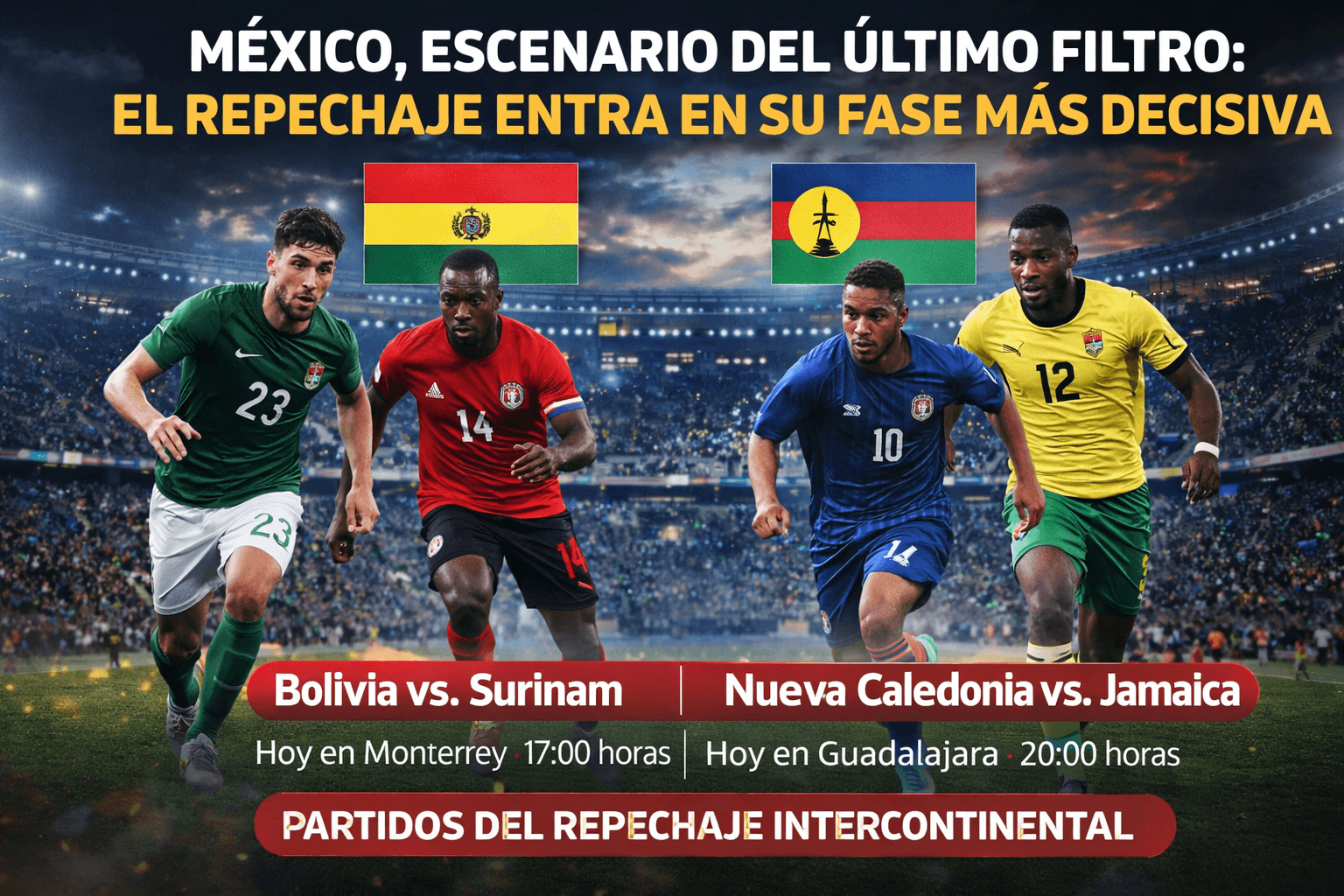 En territorio mexicano, la actividad arranca con dos encuentros clave. En Guadalajara, Nueva Caledonia enfrenta a Jamaica, mientras que en Monterrey, Bolivia se mide ante Surinam, ambos partidos correspondientes a las semifinales del repechaje intercontinental.
